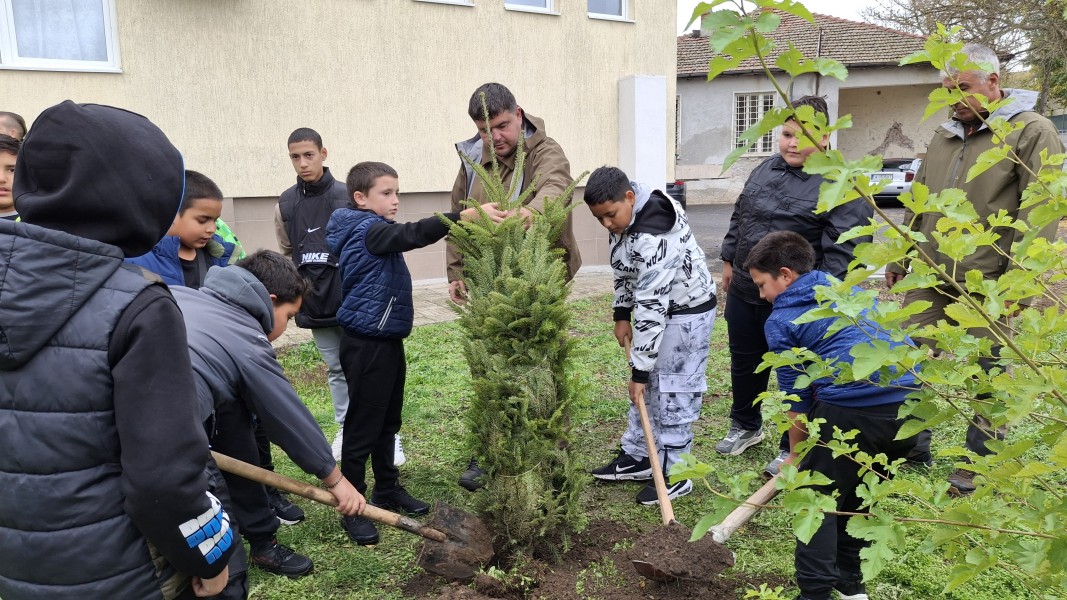 противообществените прояви на малолетните и непълнолетните (МКБППМН). С професионална подкрепа от лесничеи на ДГС „Елхово“, децата засадиха три ели в двора на обновеното училище и две около новата детска площадка.