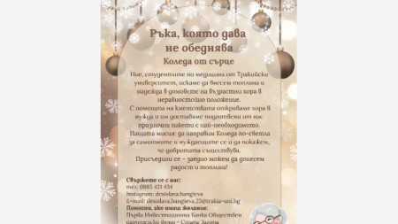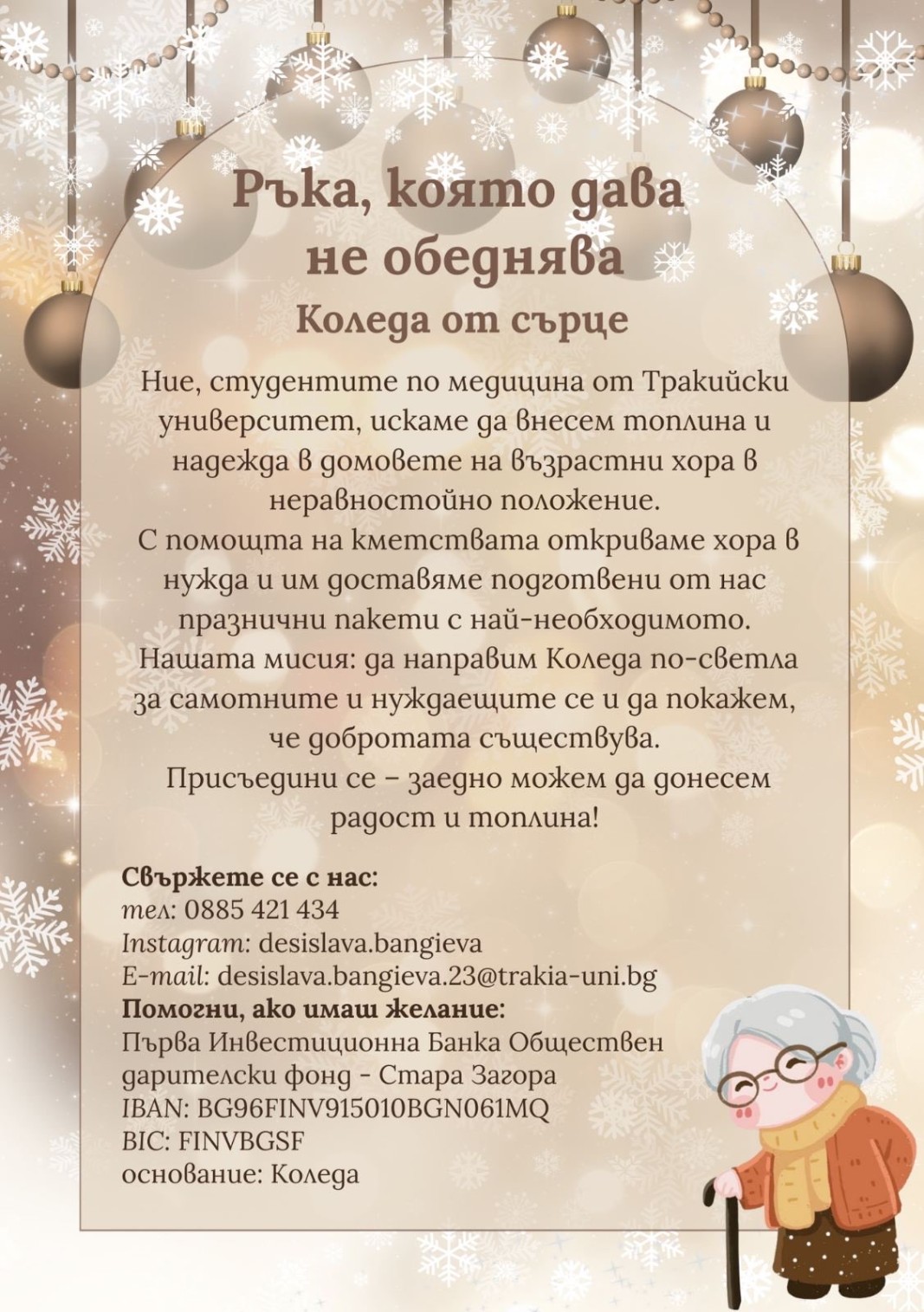 Студенти от Медицинския факултет на Тракийски университет - Стара Загора организират благотворителна инициатива „Коледа от сърце", насочена към възрастни хора в неравностойно положение от малките населени места в региона. С посланието „Ръка, която дава, не обеднява" те си поставят за цел да внесат не само материална подкрепа, но и внимание, човечност и любов в празничните дни.