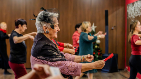 “ Az sam tuk ” (Ben buradayım) projesine katılan yaşlı bayanlar , Bulgar halk dansları ve Latino ile balo dansları derslerine katılırken..