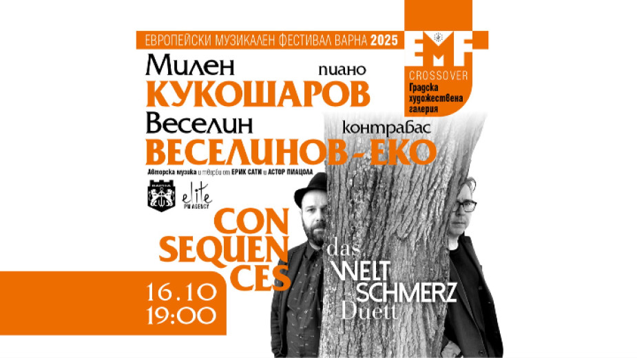 След извикалото бурни аплаузи вълнуващо начало с юбилейния концерт на класическото клавирно дуо Аглика Генова - Любен Димитров, Европейският музикален фестивал Варна 2025 продължава на 16 октомври отново с представяне на двама артисти в Градската художествена галерия. Този път специалното преживяване ще бъде за почитателите на джаза и на кросоувър идеите в съвременната музика. Емблематичните фигури от българската джаз сцена, пианистът Милен Кукошаров и контрабасистът Веселин Веселинов – Еко, ще представят своя втори албум "Consequences" (Последици). Техният дует Das Weltschmerz DueTT ще покани публиката на среща с импровизации върху творби на Ерик Сати и Астор Пиацола, които органично се сливат с новаторската им авторска музика.