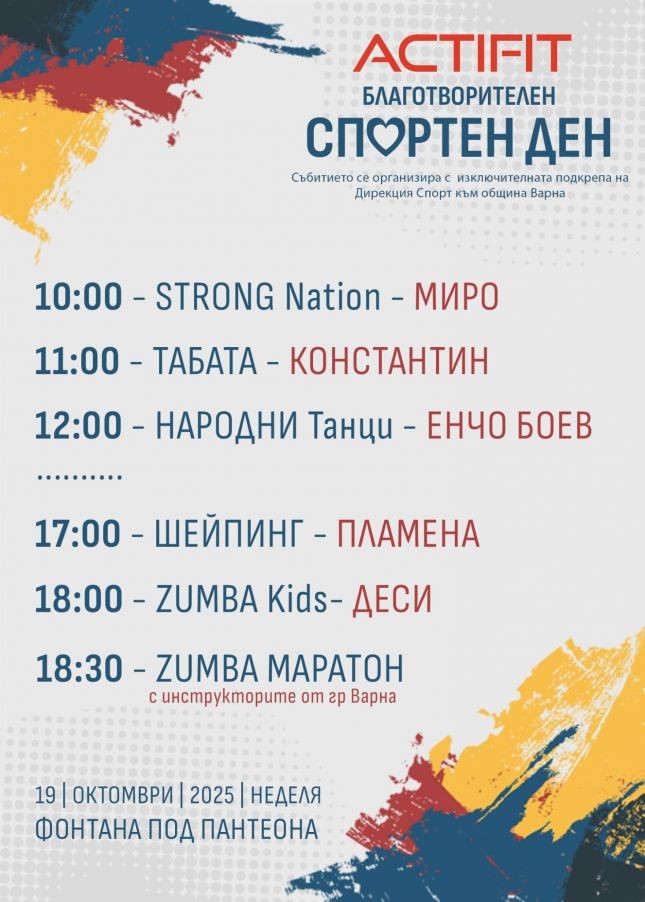 Варна отново ще се превърне в столица на движението и доброто настроение. На 19 октомври, неделя, в пространството около фонтана под Пантеона ще се проведе третото издание на спортния фестивал ActiFit Fest, който събира всички, за които спортът е начин на живот. Организатор е спортен клуб „Актифит“ с подкрепата на Община Варна.