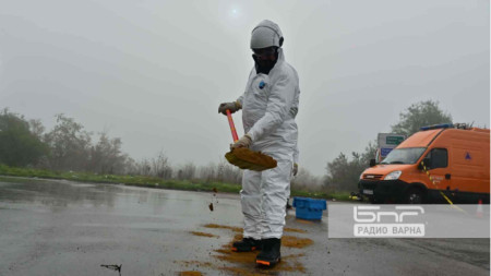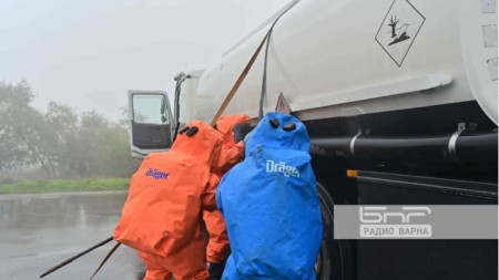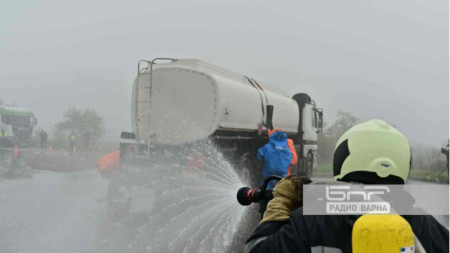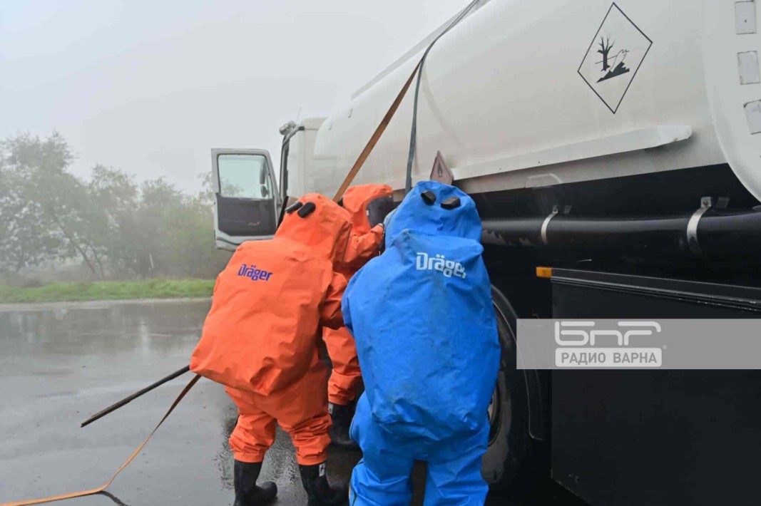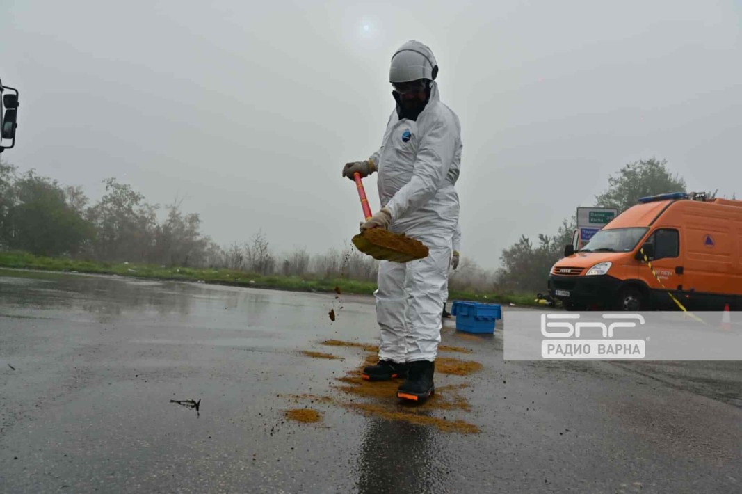 След пристигането на специализираните автомобили, експертите първо проучиха обстоятелствата и пристъпиха към ограничаването на разлива. Междувременно течът е спрян, а на пътя е насипано вещество, което да неутрализира разлетия химикал.