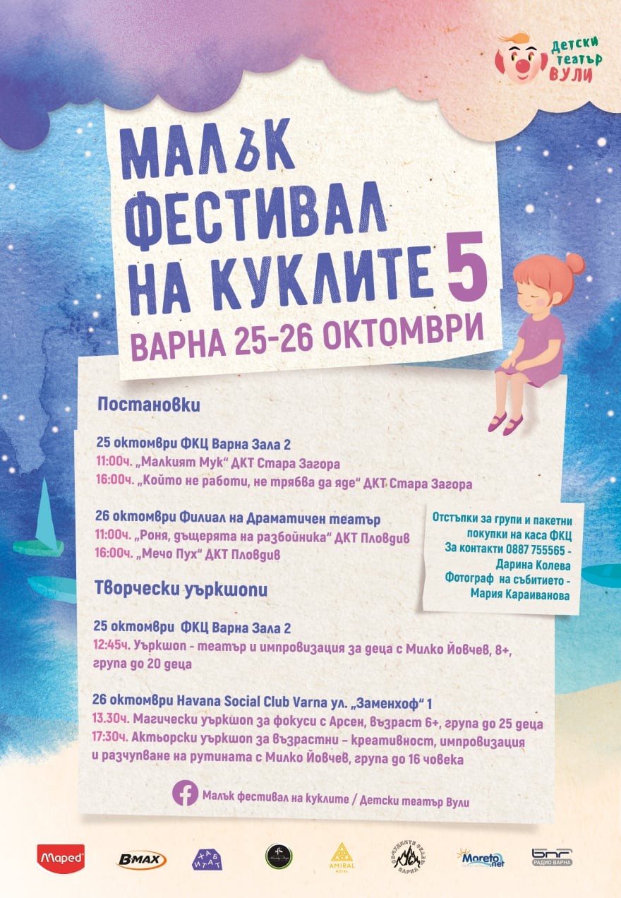 Малък фестивал на куклите е събитие, което за пети път ще срещне децата и техните родители с едни от най-добрите куклени спектакли. Датите тази година са 25 и 26 октомври. Сцените - сцена "Филиал" на Драматичен театър "Стоян Бъчваров" и залите на Фестивалния и конгресен център във Варна.