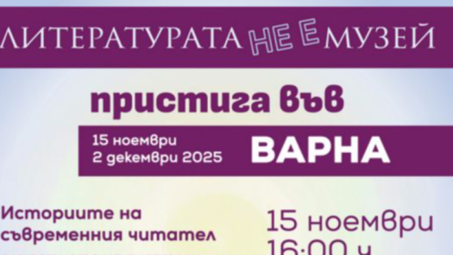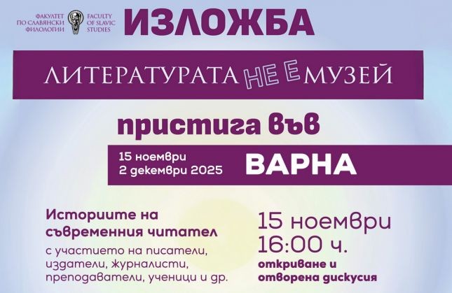 Гостуващата изложба „Литературата не е музей“ ще бъде открита на 15 ноември, от 16:00 ч. във фоайето на Регионалната библиотека „Пенчо Славейков“ във Варна. Инициативата е създадена от Факултета по славянски филологии на Софийския университет „Св. Климент Охридски“ и поставя акцент върху нуждата от реформа и обновяване на учебното съдържание по литература в българските училища.