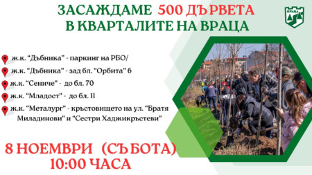 В събота, на 8 ноември, във Враца ще се реализира поредния етап от кампанията „Зелена Враца" – нашата обща мисия за по-зелен, подреден и уютен град. В рамките на инициативата ще бъдат засадени над 500 нови дървета в жилищните квартали „Дъбника", „Сениче", „Металург" и „Младост". В залесяването ще се включат служители на общинската администрация,..
