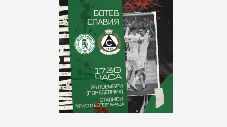 Ботев /Враца/ посреща Славия в понеделник в мач от 16-ия кръг на Първа футболна лига. Началният час на срещата на стадион „Христо Ботев" е 17,30 часа. Домакините са седми във временното класиране с 21 точки, а софиянци са 10-и с 18 пункта. Валентин Железов ще е главен съдия на двубоя, като в него ще му помагат Станимир Илков и Владимир Шавов. Наряд за..