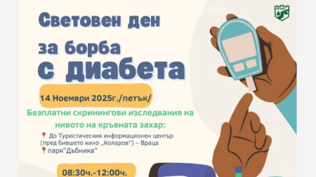 Враца ще отбележи Световния ден за борба с диабета , съобщиха от местната управа. В петък, на 14 ноември, Община Враца ще се включи в отбелязването на Световния ден за борба с диабета, обединявайки усилията си с редица местни и национални партньори в подкрепа на здравето и информираността на гражданите. Инициативата ще се проведе съвместно с..
