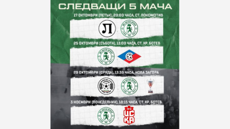 Спортно-техническата комисия към БФС насрочи датите и началните часове за още няколко срещи от програмата на врачанския Ботев в Първа футболна лига. Ботев гостува в петък /17 октомври/ в Пловдив, а мачът срещу Локомотив на стадиона в парк „Лаута" е от 20 часа. Срещата е от програмата на 12-ия кръг. На 25 октомври Ботев ще Септември, като срещата е..