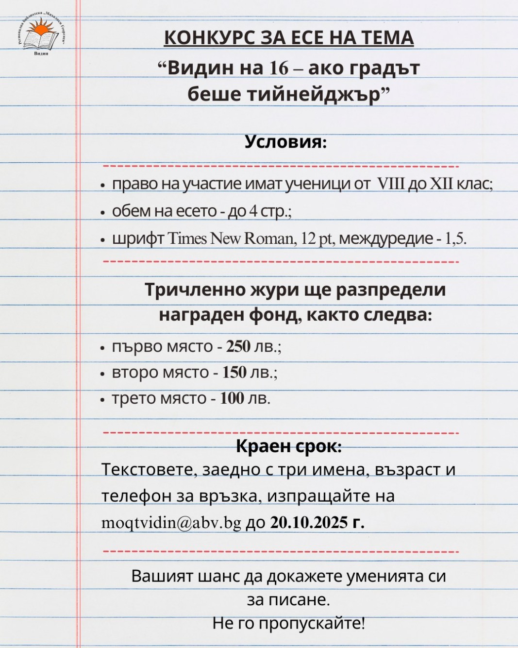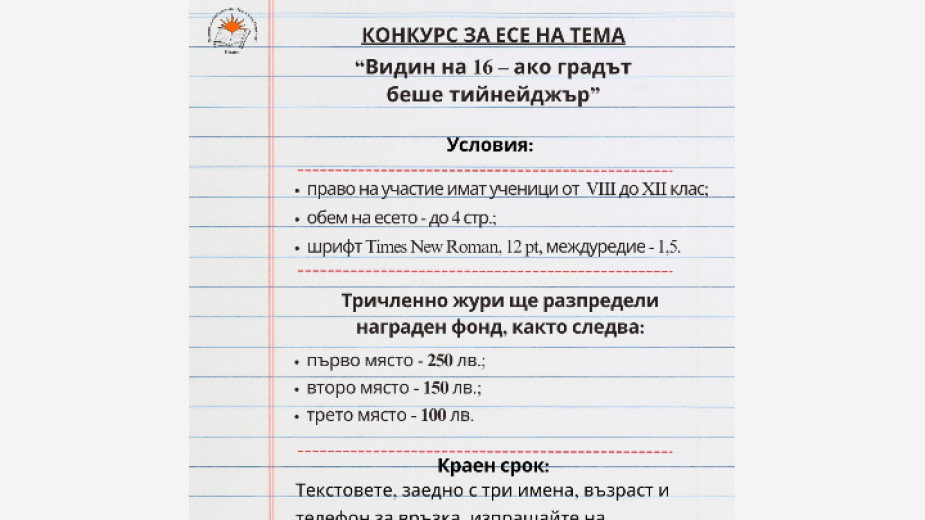 Регионална библиотека „Михалаки Георгиев“ Видин, с подкрепата на проф. Димитър Стоянов, обявяват конкурс за есе по повод духовния празник на Видин – Димитровден. Подробностите от Веселка Виткова, Връзки с обществеността в културната институция: