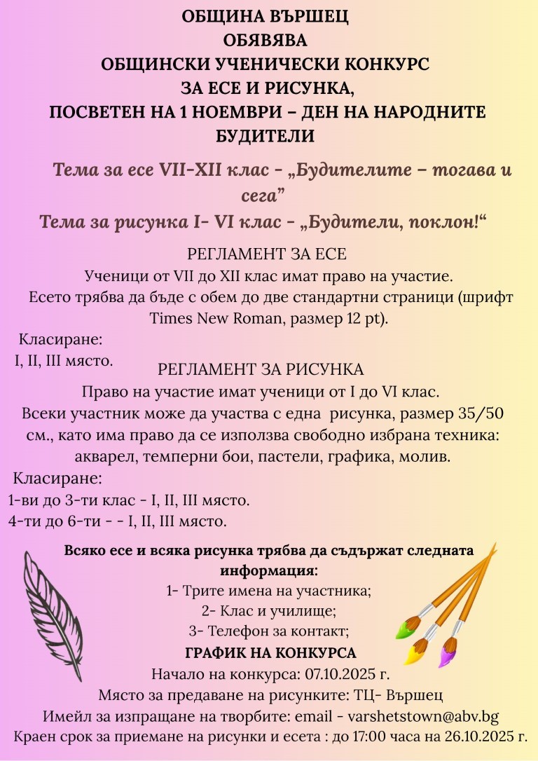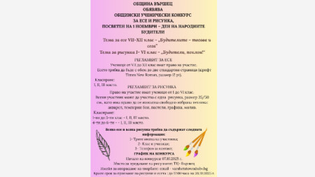 Община Вършец организира конкурс за есе и рисунка, посветен на 1 ноември. Учениците от VII до XII клас могат да участват с есе на тема „Будителите – тогава и сега“, а учениците от I до VI клас – с рисунка на тема „Будители, поклон!“.