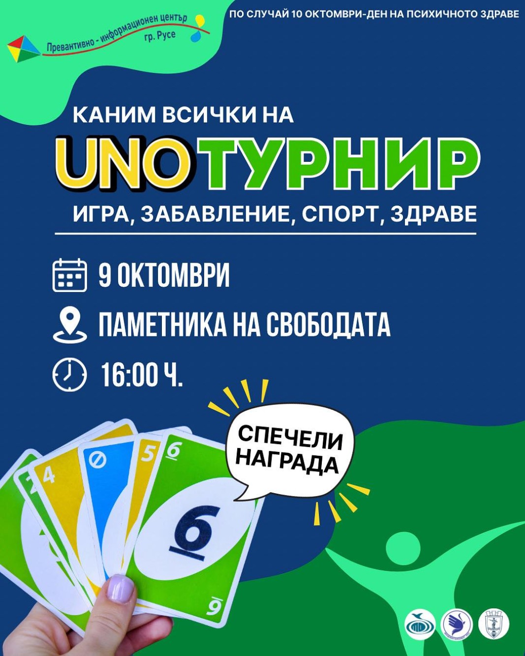 Русе ще отбележи Световния ден на психичното здраве 10 октомври с турнир по UNO. Това е настолна игра с карти. Състезанието ще се проведе днес, на 9 октомври, от 16:00 часа пред Паметника на свободата в дунавския град. Организатори са Превантивно-информационният център по наркотични вещества – Русе и техните доброволци, съвместно с Общинския младежки дом и Младежкия парламент, със съдействието на Община Русе.