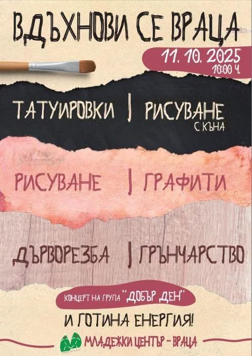 Днес /на 11 октомври/ Младежки център – Враца ще бъде домакин на вдъхновяващото събитие "Вдъхнови се, Враца!", организирано от талантливата Мира Цветкова. Центърът ще се превърне в творческо пространство, където младите хора ще могат да опитат различни форми на изкуство и да открият своето призвание.