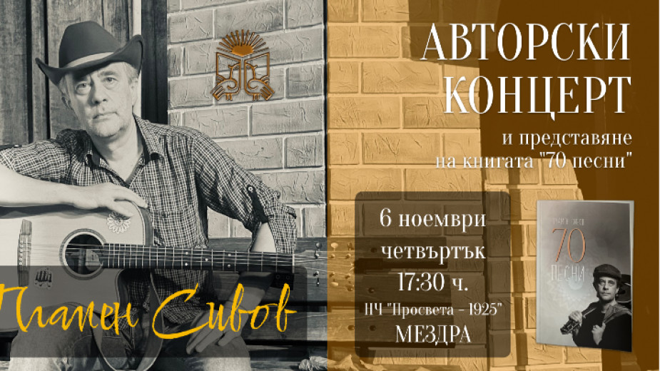 По покана на литературен клуб ‚Христо Ботев“ към НЧ „Просвета 1925“ - град Мездра в навечерието на големия християнски празник Събор на св. архангел Михаил (Архангеловден) поетът с китара Пламен Сивов ще изнесе авторски концерт и ще представи най-новата си книга - сборника „70 песни“, в града край крепостта „Калето“.