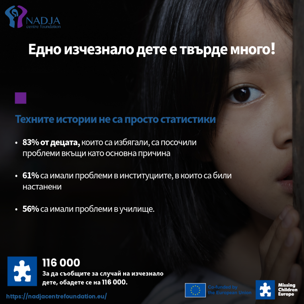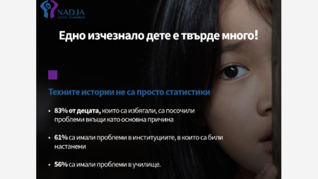 Фондация "Център Надя" започна национална информационна кампания, посветена на проблема с бягството на деца от дома и институциите, в които са настанени. Кампанията ще протече под надслов "Едно изчезнало дете е твърде много". Идеята е да се повиши обществената осведоменост за горещата телефонна линия за изчезнали деца 116 000 и услугите, които се предлагат в подкрепа но децата и семействата в нужда, каза д-р Росанка Венелинова- психиатър, председател на фондацията: