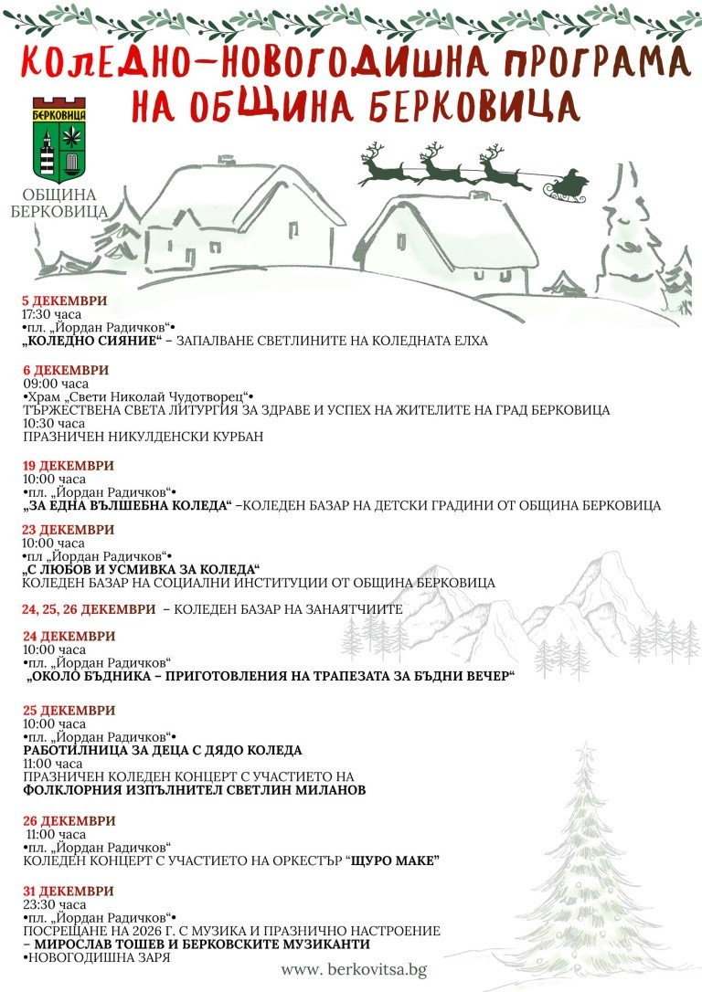 Вече е ясна програмата на Община Берковица за посрещане на коледно-новогодишните празници, съобщиха от местната администрация. Събитията започват на 5 декември с „Коледно сияние“ и запалване на светлините на елхата на централния площад, с участие на децата от детските градини. На 6 декември в храма „Свети Николай Чудотворец“ ще бъде отслужена литургия за здраве и успех, последвана от безплатен Никулденски курбан.
