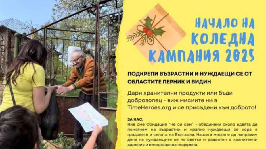 Фондация "Не си сам" набира доброволци, както и хранителни продукти за коледната си кампания във Видинско. Кампанията стартира по-рано този месец, каза съоснователят на фондацията Симеон Лазаров. Целта е да достигне до поне 150 души, които живеят в затруднение.